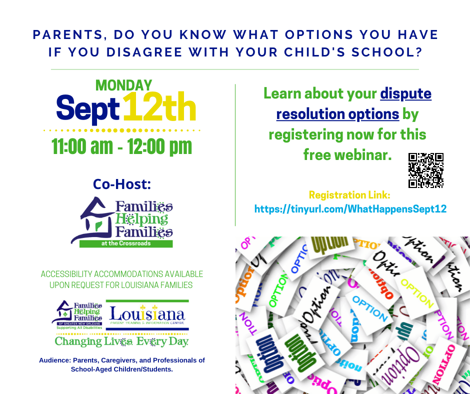 Join us for this interactive training as we discuss Special Education dispute resolution options when parents disagree. Please register ahead of time @ https://events.r20.constantcontact.com/register/eventReg?oeidk=a07ejbld3619e7de287&oseq=&c=&ch=